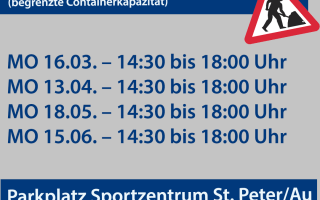 Aufgrund des derzeit gesperrten Altstoffsammelzentrums St.Peter wurde in Absprache mit Obmann Johannes Heuras und der Geschäftsführung (GDA) Eva Zirkler ein Notbetrieb zur Sammlung von Karton und Sperrmüll am Parkplatz beim Sportzentrum in St. Peter/Au eingerichtet.