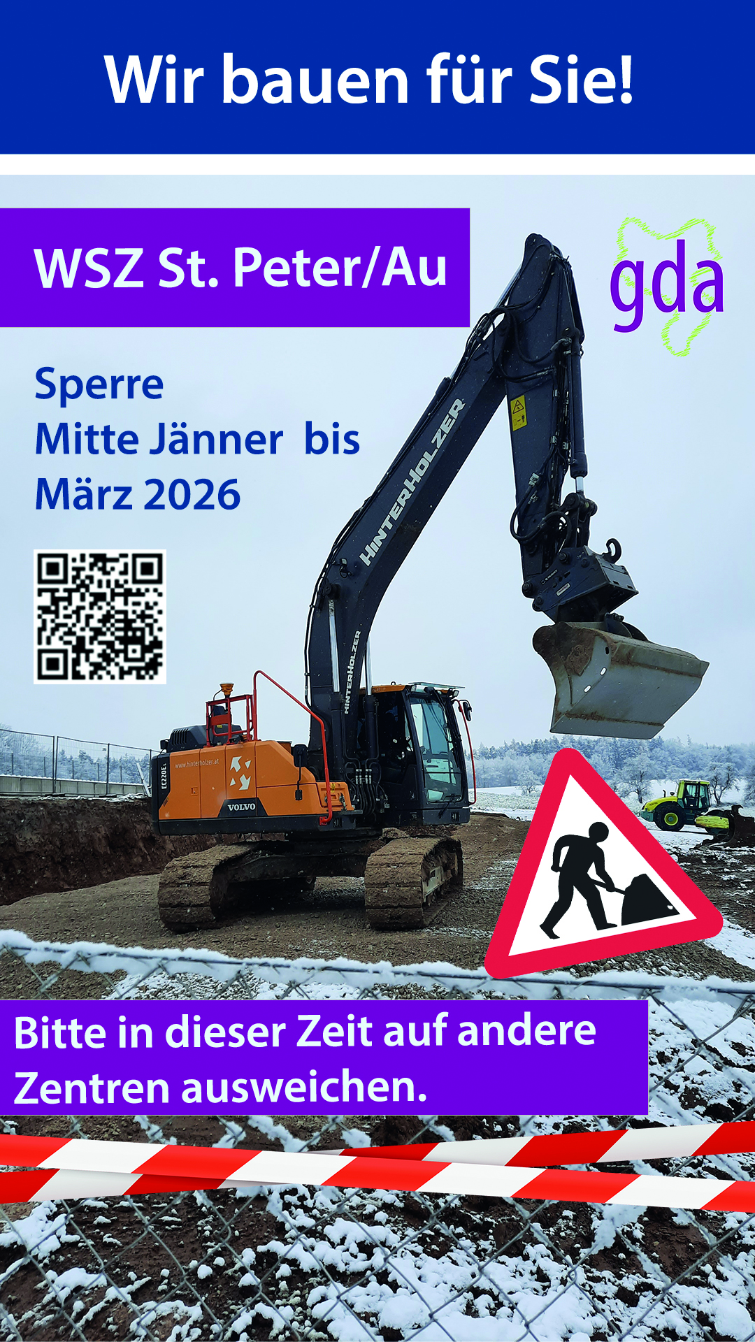 Das Altstoffsammelzentrum ASZ St. Peter in der Au wird in ein modernes Wertstoffzentrum umgebaut und ist bis voraussichtlich März 2026 nur eingeschränkt in Betrieb bzw. gesperrt.