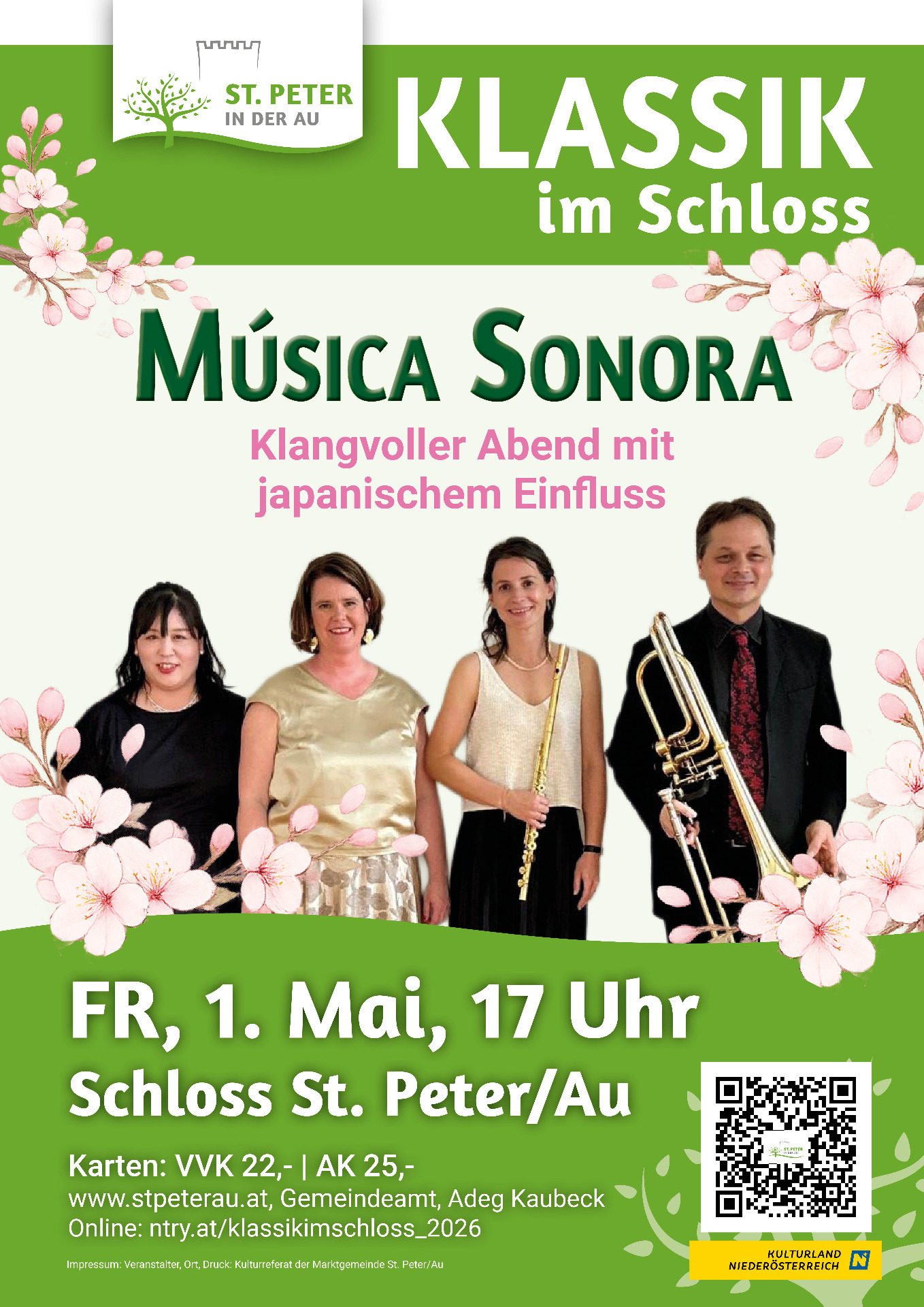 Tickets erhältlich am Gemeindeamt St. Peter in der Au, bei ADEG Kaubeck sowie im Online-Verkauf unter ntry.at/klassikimschloss_2026