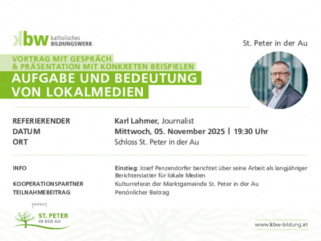 In den letzten fünf Jahrzehnten ist vieles in der Großgemeinde St. Peter/Au geschehen. Wir bitten um Ihre Unterstützung, um diese Zeit auch mit Bildmaterial dokumentieren zu können!