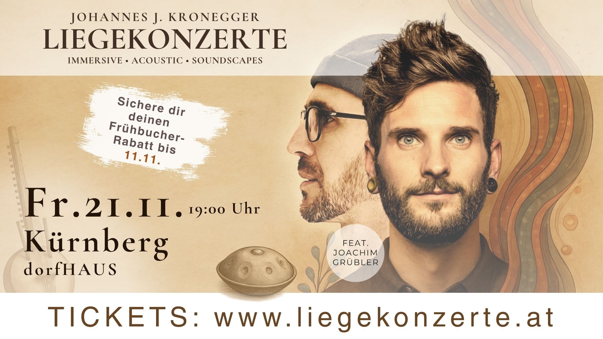 Erlebe einen einzigartigen Klangraum in Kürnberg. Du legst dich entspannt zurück, schließt die Augen und tauchst ganz in die live komponierten Soundlandschaften ein. Jeder Ton entsteht einmalig im Hier und Jetzt – mal getragen von sanften Ambient-Flächen, mal untermalt von leichten Percussion- oder Hangklängen. Keine Liegekonzert gleicht dem anderen, denn das Konzert folgt ausschließlich dem aktuellen Impuls.