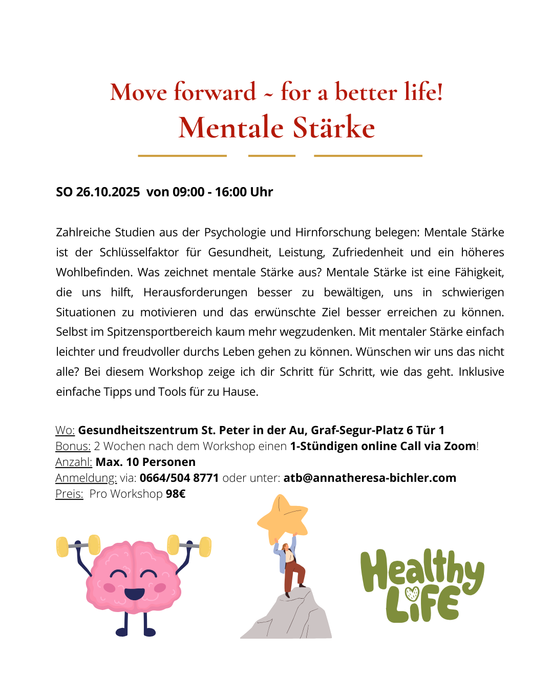 Zahlreiche Studien aus der Psychologie und Hirnforschung belegen: Mentale Stärke ist der Schlüsselfaktor für Gesundheit, Leistung, Zufriedenheit und ein höheres Wohlbefinden. Was zeichnet mentale Stärke aus? Mentale Stärke ist eine Fähigkeit, die uns hilft, Herausforderungen besser zu bewältigen, uns in schwierigen Situationen zu motivieren und das erwünschte Ziel besser erreichen zu können. Selbst im Spitzensportbereich kaum mehr wegzudenken. Mit mentaler Stärke einfach leichter und freudvoller durchs Leben gehen zu können. Wünschen wir uns das nicht alle? Bei diesem Workshop zeige ich dir Schritt für Schritt, wie das geht. Inklusive einfache Tipps und Tools für zu Hause.