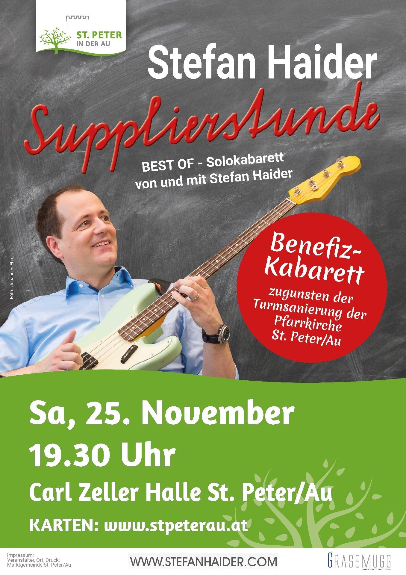 Die Marktgemeinde St. Peter/Au freut sich, die Pfarre St. Peter/Au mit einem Benefiz-Kabarettabend mit Stefan HAIDER und seinem BEST OF "Supplierstunde" zu unterstützen. Der Reinerlös der Veranstaltung kommt der Kirchturmsanierung zugute.