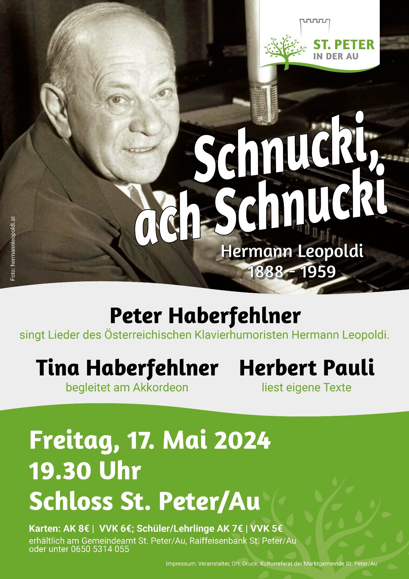 Peter Haberfehlner singt am 17. Mai 2024 um 19.30 Uhr im Schloss St. Peter in der Au Lieder von dem 1888 in Wien geborenen Humoristen, der während der Zeit der Naziherrschaft in Amerika gelebt hat und 1959 in Wien gestorben ist. Tina Haberfehlner begleitet den Sänger am Akkordeon und Herbert Pauli wird verbindende Worte beisteuern.