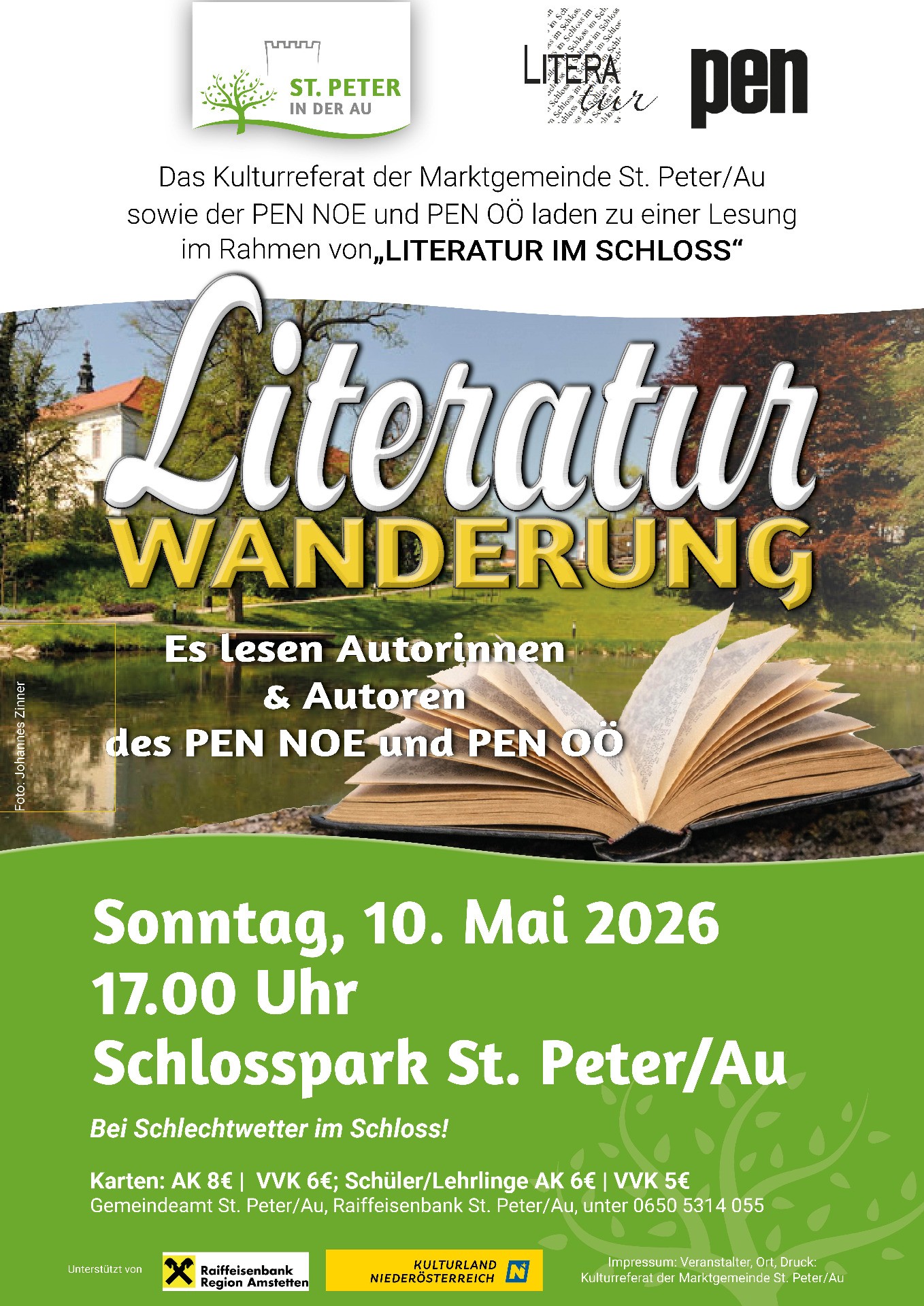 Zum ersten Mal lädt das Kulturreferat im Rahmen von Literatur im Schloss zu einer literarischen Entdeckungsreise durch den Schlosspark St. Peter in der Au ein. Am 10. Mai um 17 Uhr erwartet die Besucherinnen und Besucher ein Spaziergang voller Poesie, Frühlingsduft und literarischer Überraschungen – bei Schlechtwetter findet die Veranstaltung im Schloss statt.