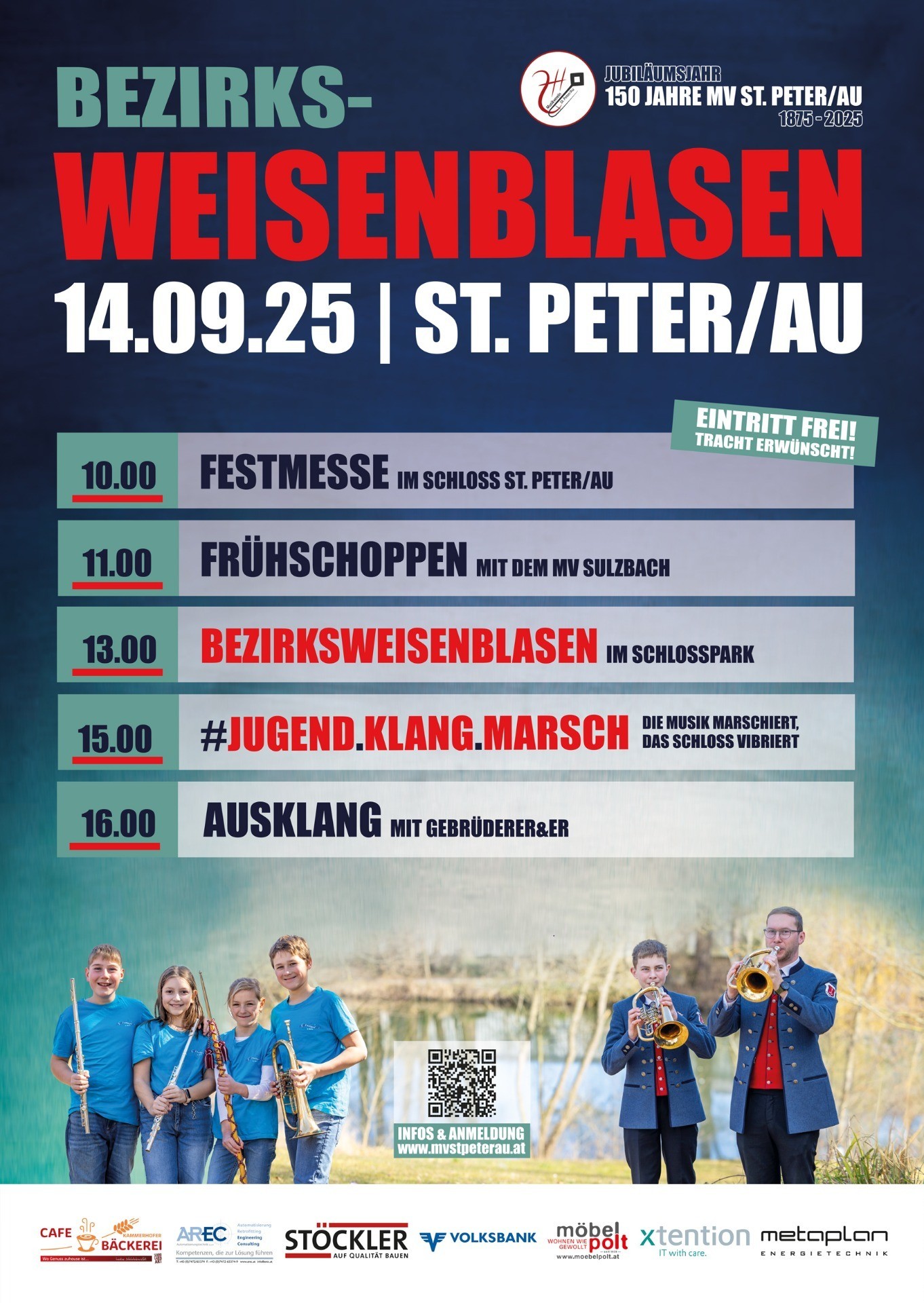 Im Rahmen des 150-jährigen Jubiläums veranstaltet der Musikverein St. Peter/Au das Bezirksweisenblasen im Schlosspark St. Peter/Au. Zahlreiche Musikgruppen aus der Umgebung werden im wunderschönen Ambiente neben dem Schlossteich ab 13 Uhr musizieren. Ein besonderes Highlight beginn um 15 Uhr, wo Musikjugendgruppen aus St. Peter und Umgebung gemeinsam unter dem Motto „#Jugend.Klang.Marsch“ vom Schlosspark in den Schlosshof marschieren werden.